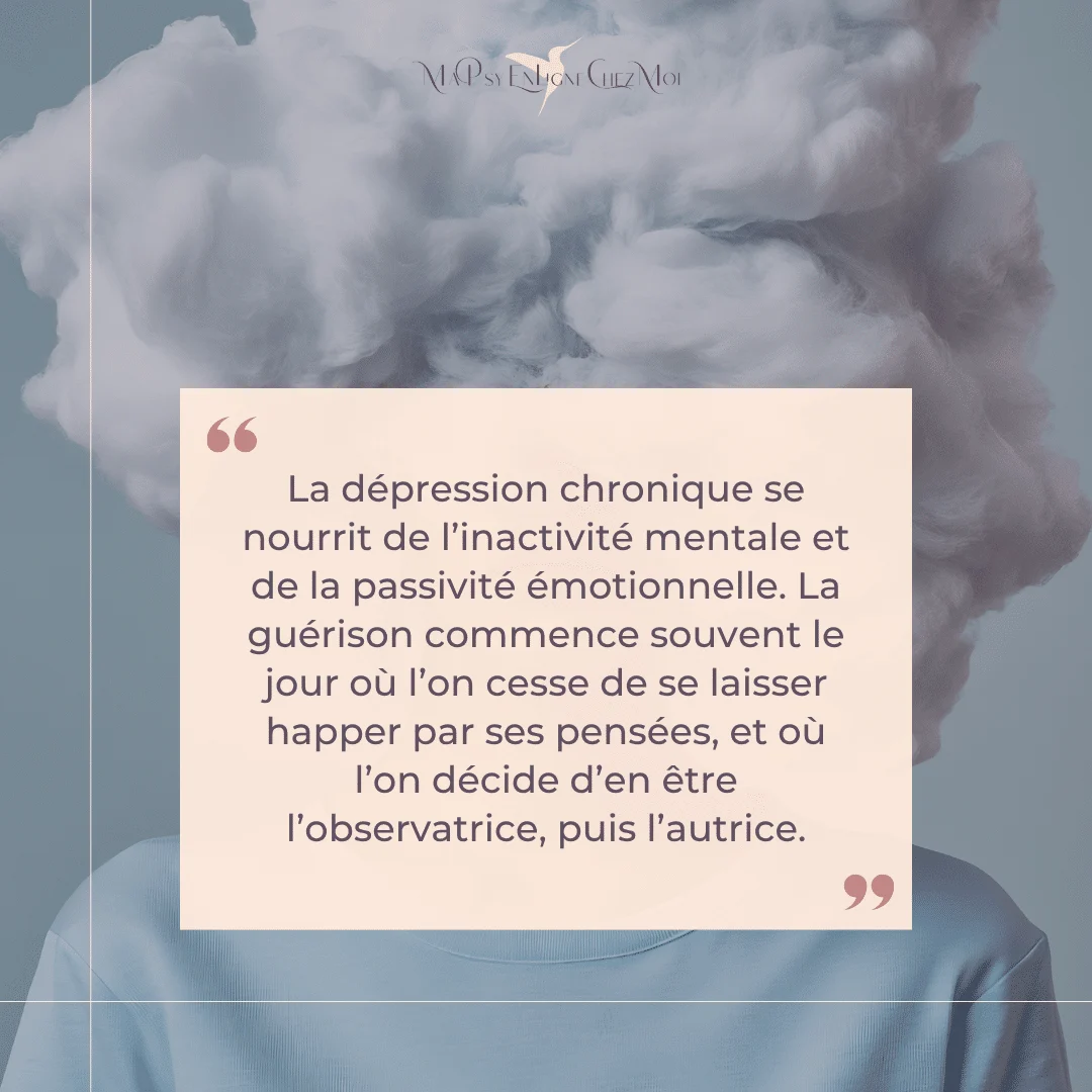La dépression chronique se nourrit de l’inactivité mentale et de la passivité émotionnelle. La guérison commence souvent le jour où l’on cesse de se laisser happer par ses pensées, et où l’on décide d’en être l’observatrice, puis l’autrice.