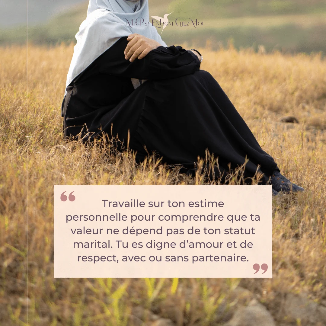 Travaille sur ton estime personnelle pour comprendre que ta valeur ne dépend pas de ton statut marital. Tu es digne d’amour et de respect, avec ou sans partenaire.