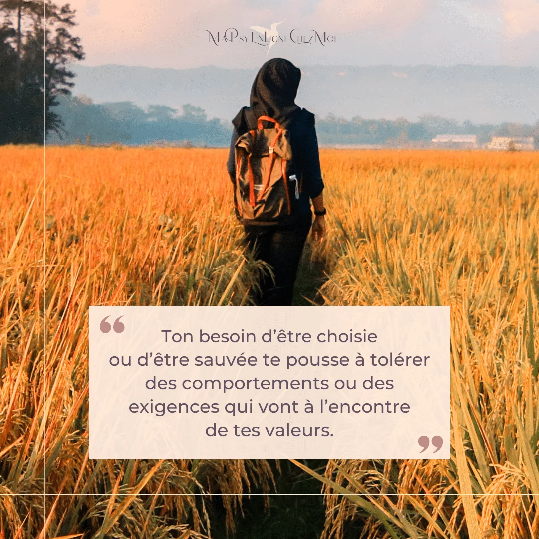 Ton besoin d’être choisie ou d’être sauvée te pousse à tolérer des comportements ou des exigences qui vont à l’encontre de tes valeurs. Tu peux même renoncer à tes principes, croyant que c’est le prix à payer pour atteindre ton objectif de sécurité ou de bonheur.